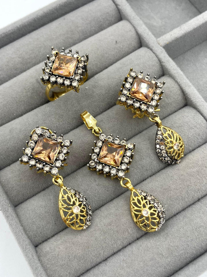 Oxidized gold plated combo set With adjustable ring and clip lock studs and with chain