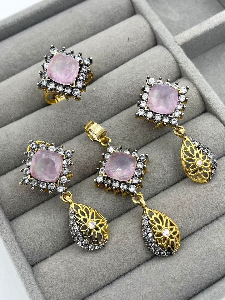 Oxidized trendy Pendant set With adjustable ring and clip lock studs in addition to complementary chain
