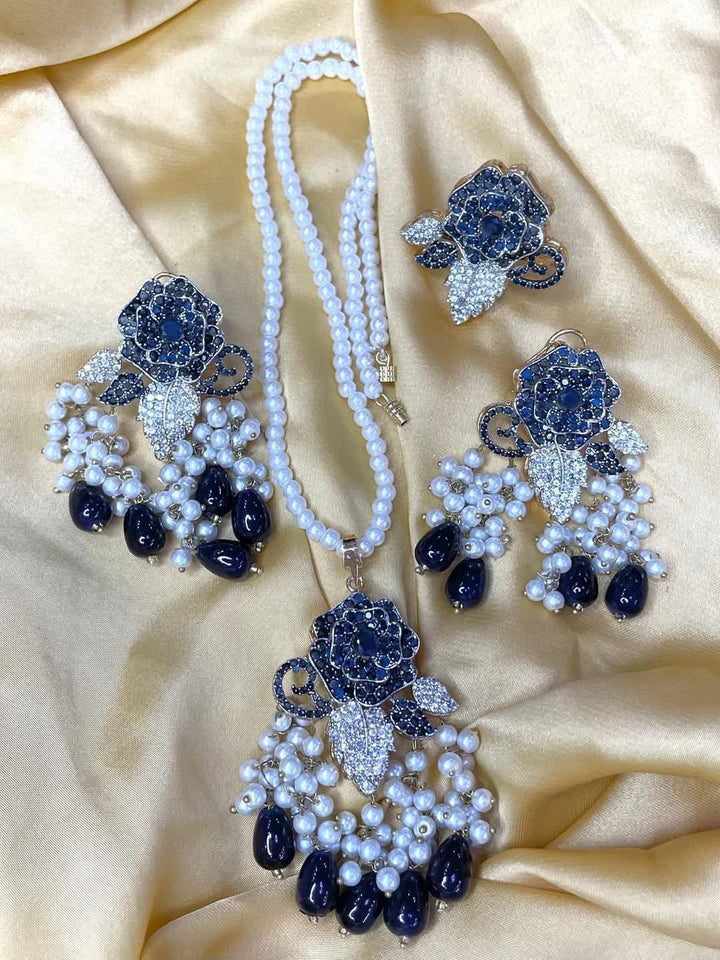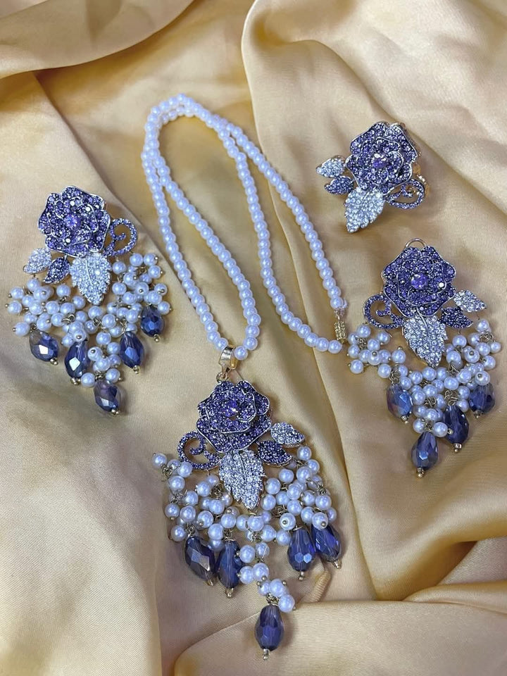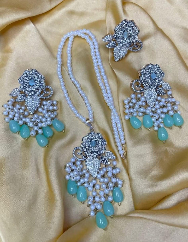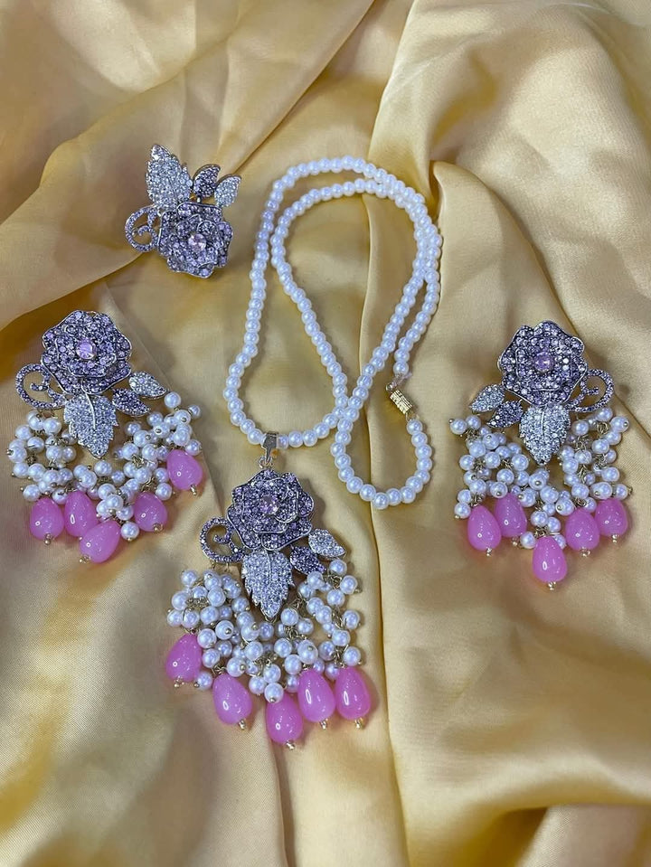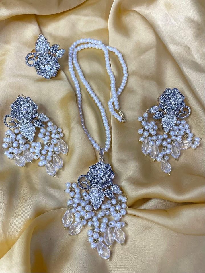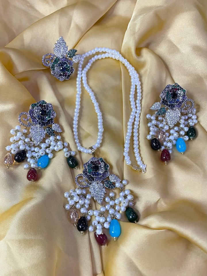 Trendy pendant set Comes with long pearl mala Clip Lock studs Adjustable ring